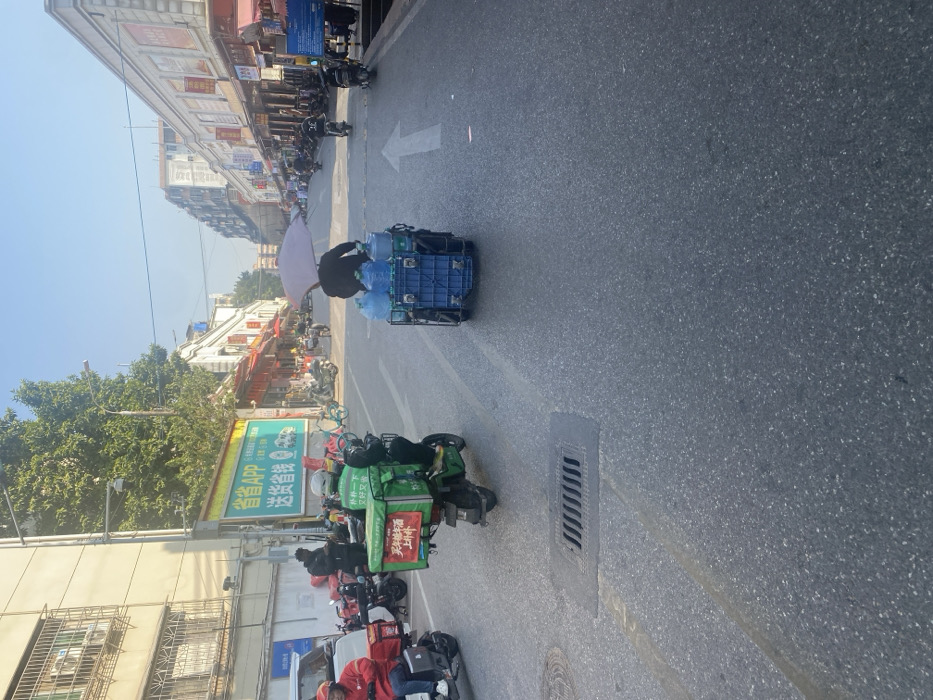 An urban street scene is shown, with delivery drivers on scooters and a person pushing a cart full of water jugs. The street has an arrow painted on it, indicating the direction of traffic. Shops and buildings line the side of the street, and a large billboard advertises a delivery app. The scene captures the busy atmosphere of a commercial area in a city.