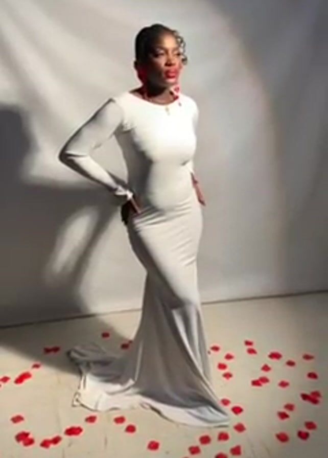 A dark-skinned woman with braided hair stands in a white, long-sleeved, floor-length dress with her hands on her hips. She wears large red earrings and a necklace. The floor around her is covered in red rose petals. The background is a white sheet or backdrop with shadows on the left. The lighting comes from the right.