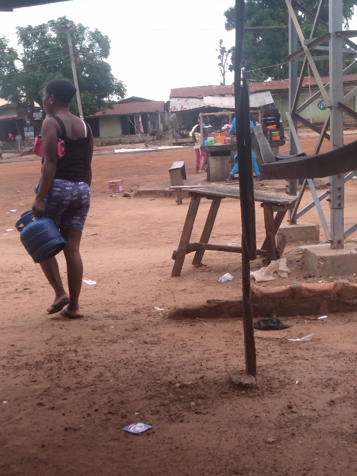 The image is a wide shot, taken at ground level from a slightly elevated perspective. It depicts a young woman, dressed in a black tank top and dark blue shorts, walking with a blue gas cylinder in her left hand in an open-air area in Asuir, Nigeria. She is walking toward the right edge of the image. The scene is likely a market or a street in Asuir, and is characterized by a dusty, reddish brown ground. There is a wooden bench in the lower right of the image, and another bench in the distance behind the woman. Further in the distance, there are three structures that look like buildings. There is a small, white, rectangular sign on a pole in the upper right background of the image, obscured by the post the image is taken from. The environment is cluttered, with a plastic bag and various pieces of litter strewn across the ground. The weather appears to be overcast.
