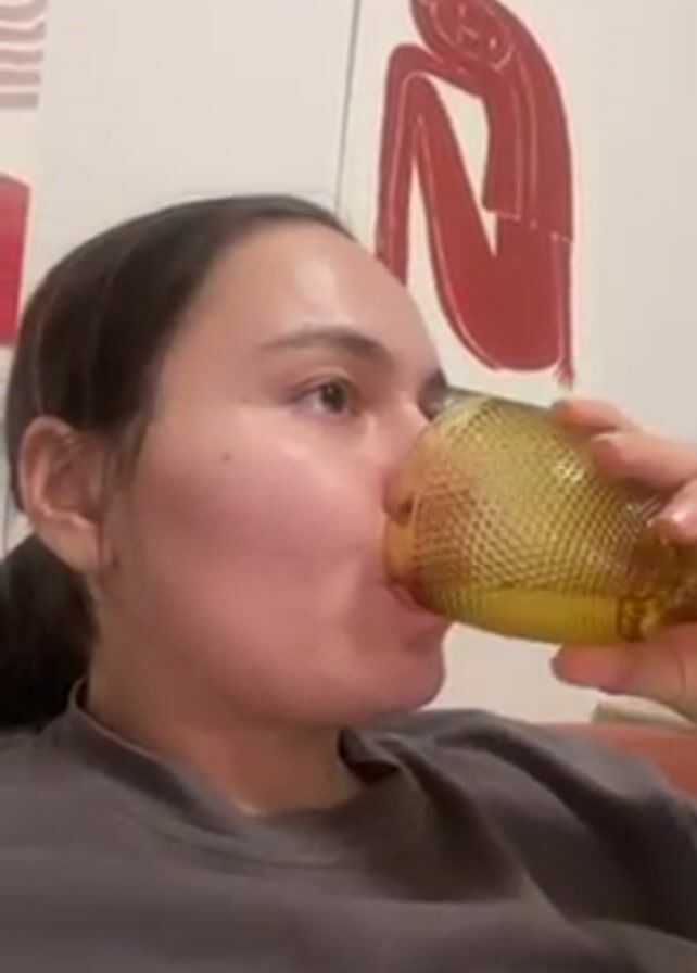 A woman with dark hair and a grey t-shirt is drinking from a patterned yellow glass in an indoor setting. She appears to be seated. The background includes artwork on a white wall, including a red drawing of a figure in a seated position.