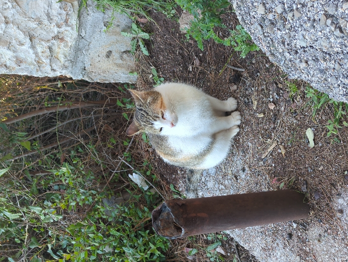 - "The image depicts an outdoor scene in Mirište, Montenegro, featuring a domestic cat as the central subject" by FM-FbzLI3, licensed under CC BY 4.0