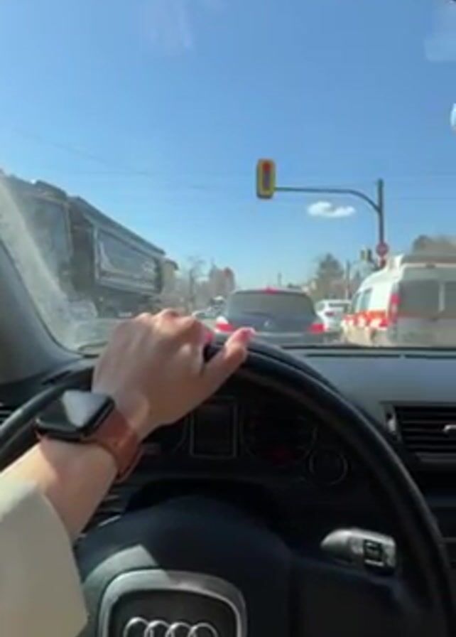 From a first-person perspective inside a car, the driver's hand rests on the steering wheel, displaying a smartwatch with a brown band. The car, an Audi based on the logo, is stationary at a traffic light which is red. Other vehicles are visible ahead, including a dump truck and an ambulance. The dashboard and interior of the car are visible, including the radio and air vents. A VIP air freshener hangs from the rearview mirror. The sky is blue with a few clouds, suggesting a sunny day. The surroundings appear to be an urban area with trees and power lines.