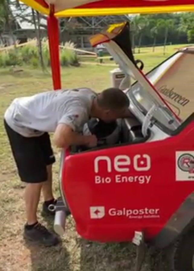 A man in a grey shirt and black shorts is working on the engine of a white and red rally car under a tent. The hood of the car is open, and the man is leaning into the engine compartment, appearing to make adjustments. The car has sponsor decals, including "neo Bio Energy" and "Galposter Energy Solution." The car has a gold colored rims, a roll cage, and a spare tire inside. The car is parked on a grassy area. Other people are visible in the background.