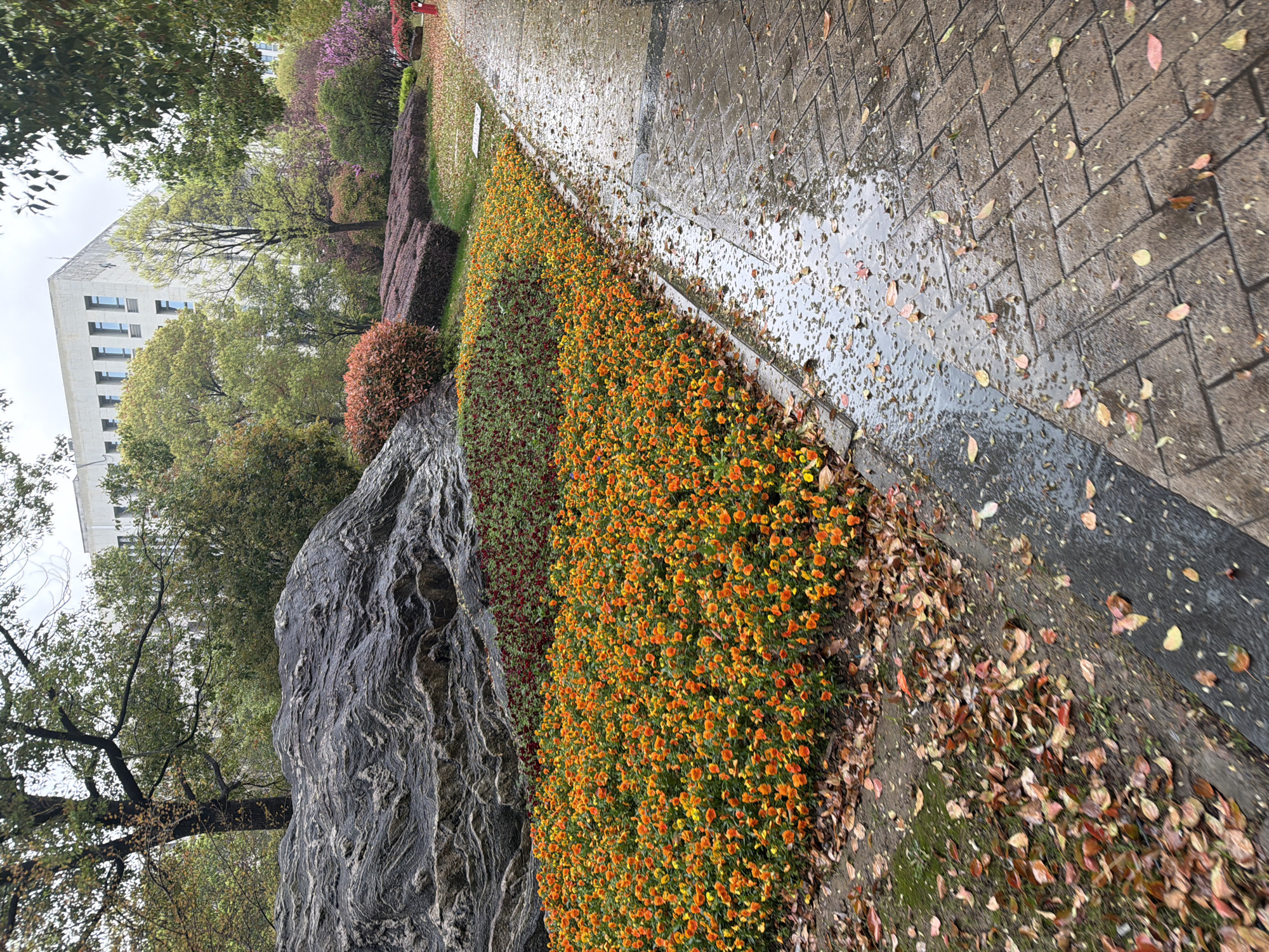 The image depicts an outdoor scene in Jiangning District, China. A pathway of rectangular pavers, wet from rain, is visible on the right side of the frame, with scattered fallen leaves. Adjacent to the path is a flower bed with orange and yellow flowers in bloom. To the left of the flower bed are shrubs and a large gray rock formation. Further to the left are trees with green foliage. A multi-story building with visible windows is in the background. The image appears to be taken from a low angle.