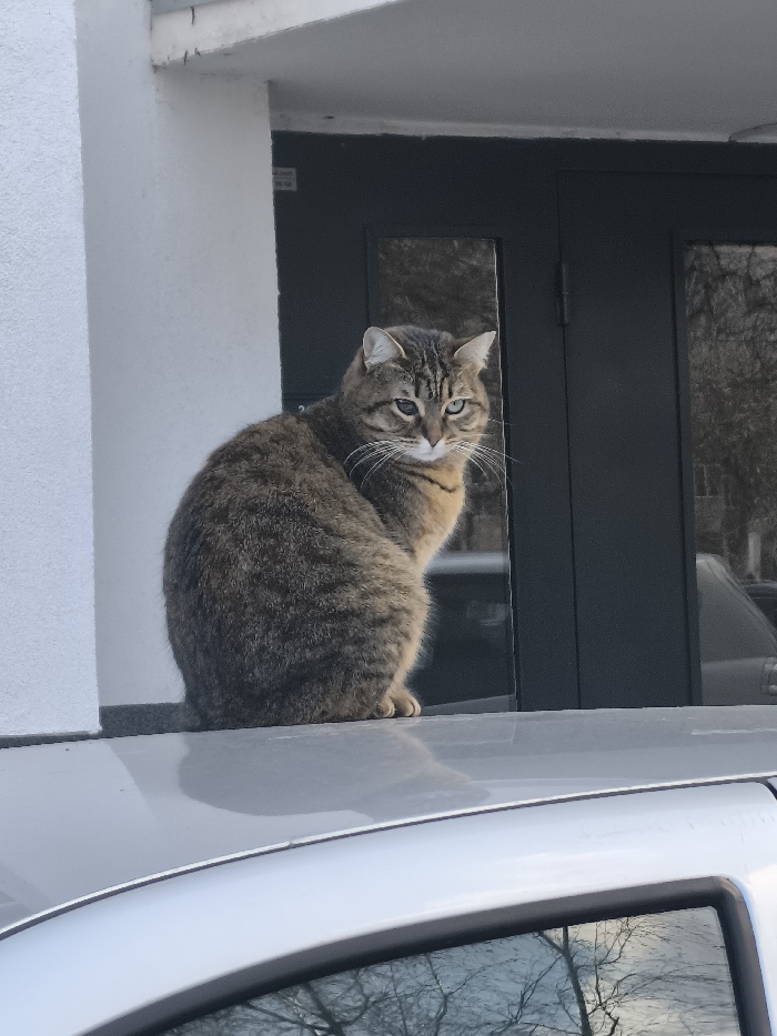 - "An adult domestic short-haired cat with brown and grey tabby fur is observed sitting upright on the silver roof of a vehicle" by FM-74ozu1, licensed under CC BY 4.0