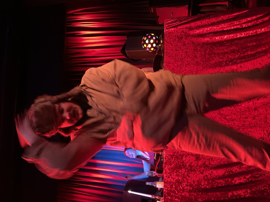 A man in a tan jacket and pants is performing or posing with blurred motion. He is positioned in front of a backdrop with horizontal red lines. To the right is a table covered in textured red fabric. A disco ball is in the upper center, and a woman is at a DJ console with bottles on the table. The lighting is predominantly red, with blue highlights on the DJ.