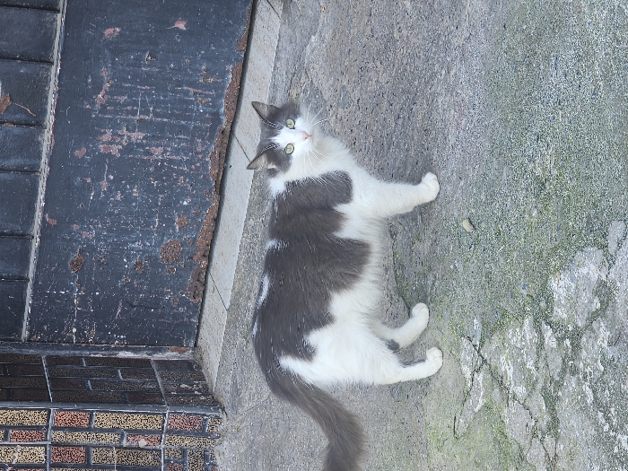 - "An adult domestic cat, exhibiting a white and dark grey patched coat with prominent green eyes, stands on a weathered concrete pavement in Salé, Morocco" by FM-HWmcZ2, licensed under CC BY 4.0