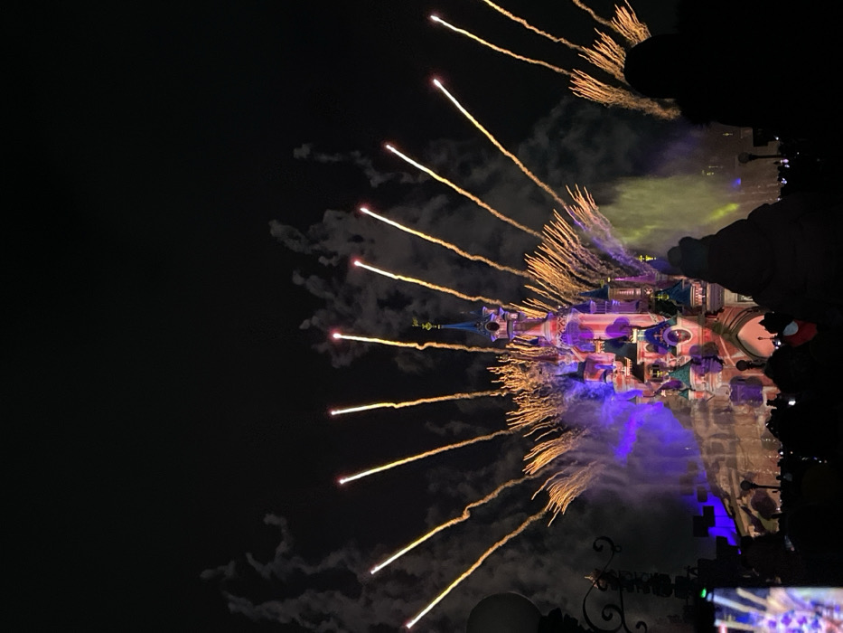 Fireworks explode over a castle silhouetted against the night sky. The castle is illuminated with purple, blue, and pink hues. Golden trails from the fireworks arch outwards, contrasting with the dark background. Clouds of smoke linger near the castle. The view is slightly tilted, and parts of foreground objects are visible at the bottom of the frame.