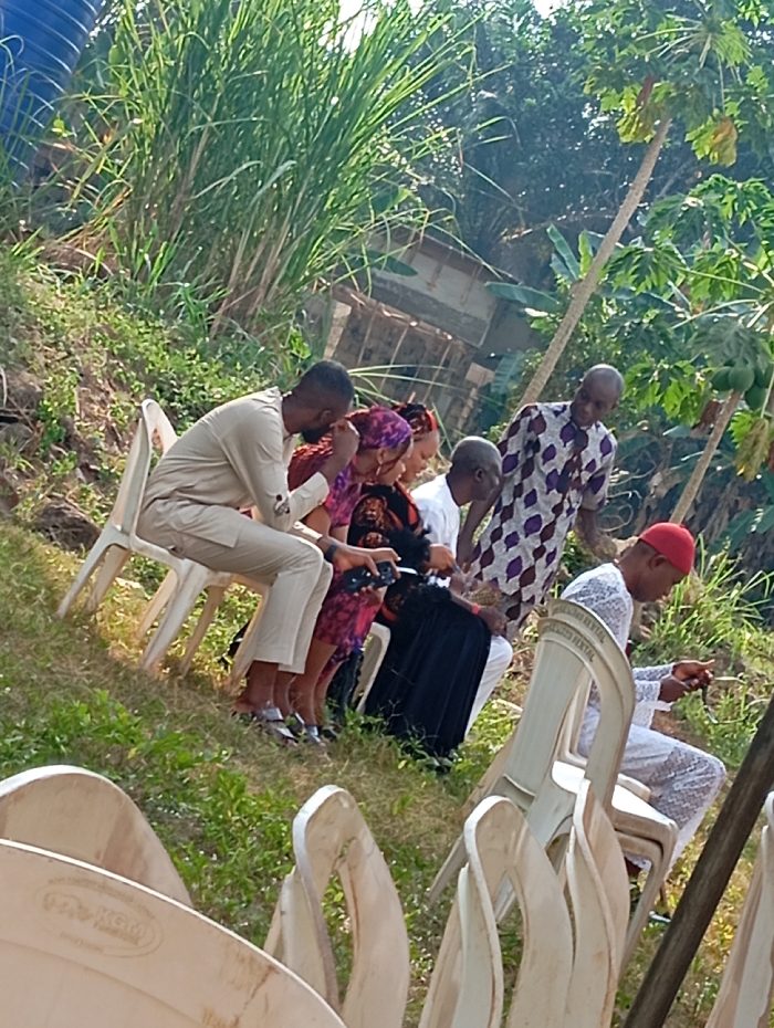 A group of people are seated in plastic chairs outdoors, seemingly attending an event. The individuals are dressed in formal attire. One man in a white outfit and red cap is in the foreground. Behind him, a row of seated individuals are wearing different colored outfits. The background consists of dense vegetation, including tall grass and trees. The setting suggests a casual, outdoor gathering.