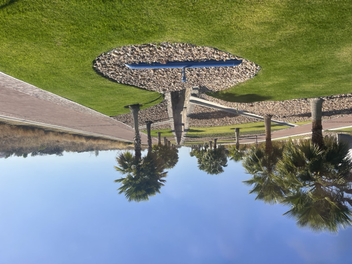 A landscape featuring a row of palm trees against a clear blue sky is captured. The ground is covered in lush green grass, interspersed with patches of brown pebbles forming a decorative border. A red brick pathway runs alongside the grass. In the background, low-lying shrubs add depth to the scene. A blue pipe-like structure is visible on top of one of the pebble patches. The image has been rotated so the sky appears to be at the bottom.