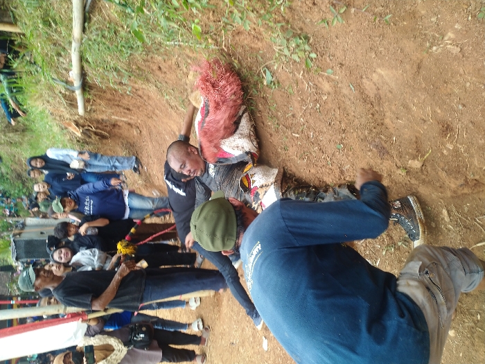 The image captures an outdoor scene on a dirt path in Kerjo, Indonesia. In the foreground, a man wearing a blue long-sleeved shirt and light-colored pants is crouched low, facing right, with his hands near the ground. Immediately to his front, a bald man in a black short-sleeved shirt and dark pants lies supine on the reddish-brown dirt, with his head positioned to the left. A large, reddish, shaggy object, possibly a costume element or prop, rests beside his right side. To the left, an elderly man in a dark green cap and dark shirt stands upright, holding a pole displaying a red and white flag, along with a braided yellow and black rope or fabric. A group of spectators, including men, women, and children, are standing on the dirt path behind the flag holder, observing the scene. Additional individuals are visible further up a steep, green, vegetated embankment on the right side of the frame. A black speaker or sound equipment is partially visible in the upper left background. The ground is uneven dirt, consistent with a rural or semi-rural setting.