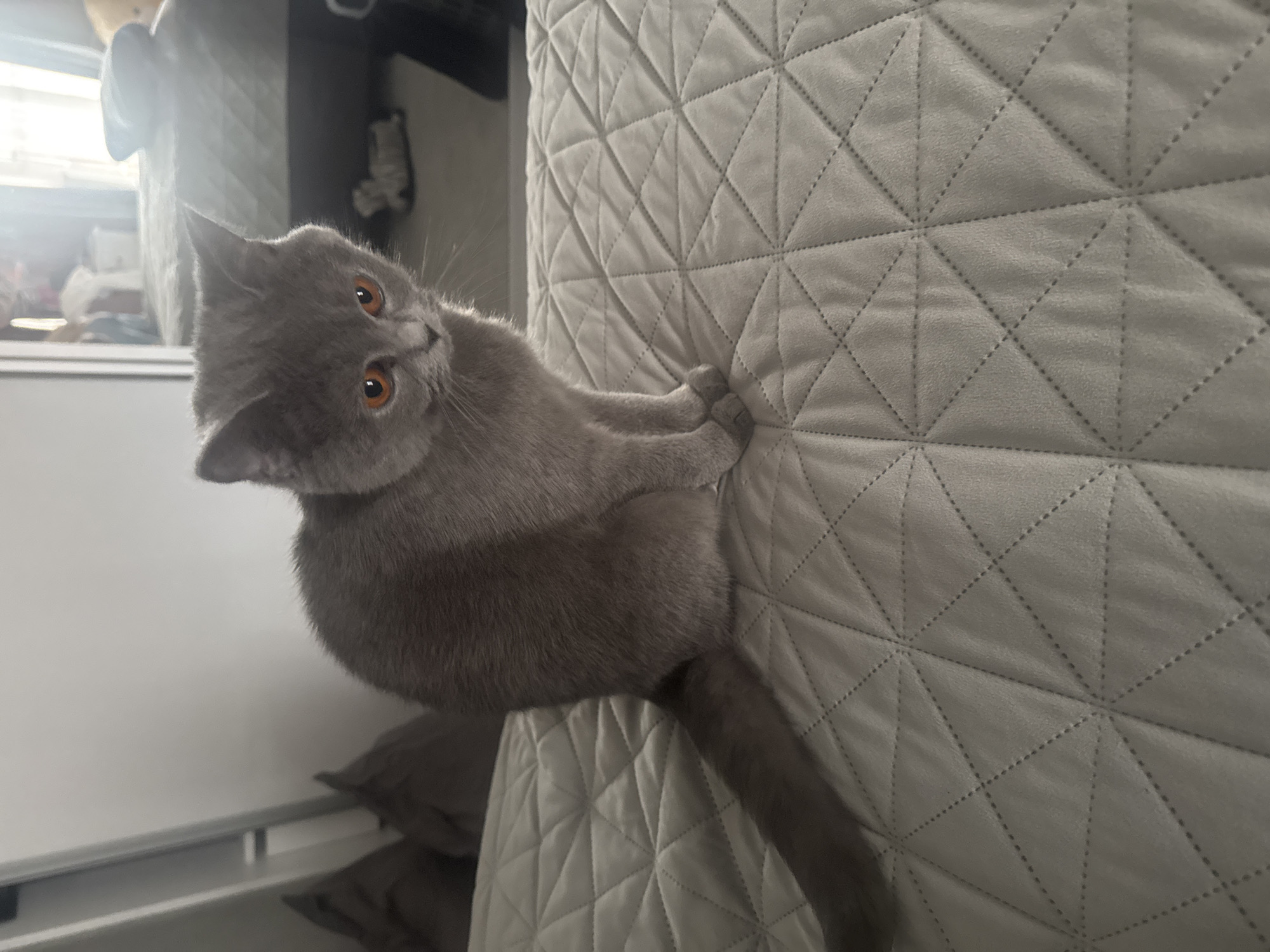 - "A grey domestic cat with prominent orange eyes is depicted seated upright on a light grey quilted bedspread with a triangular pattern" by FM-OAANt1, licensed under CC BY 4.0