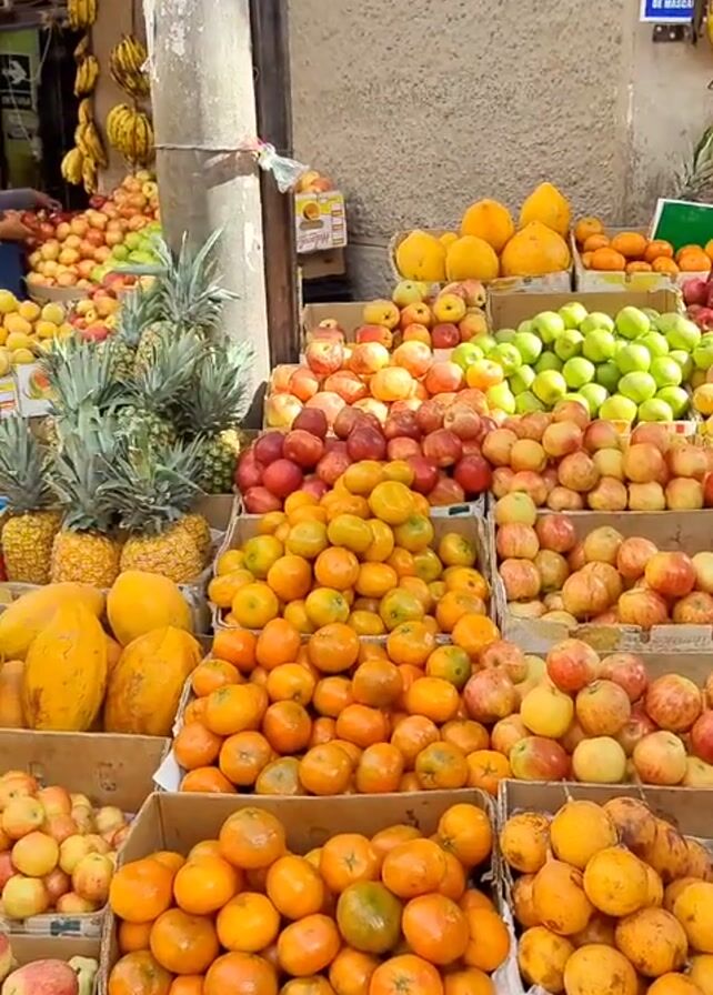 fruit stand on a street. The stand is brimming with various fresh fruits, including apples of different colors (red, green, yellow), oranges, tangerines, pineapples, papayas, grapes (green and dark), and bananas. The fruits are arranged in cardboard boxes, creating a colorful and appealing display. Two women are visible behind the fruit display. One woman is sitting, sorting and handling apples, while the other is standing behind a similar display. The scene appears to be bustling with activity, as the fruit stand is part of a street market setting. A sign is visible above the stall, but its content is not entirely clear.