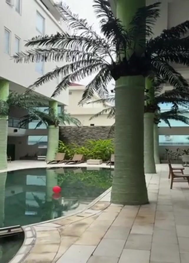 The camera pans up and to the right to reveal a hotel courtyard with a curved swimming pool that has a red ball floating in it