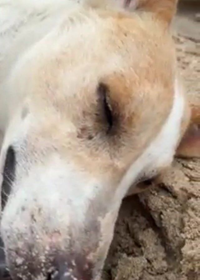 A close-up video shows a dog lying on a sandy beach. The dog has white and tan fur, and some sand is on its nose. A person's foot with painted toenails is visible near the dog's head. The person speaks in French, commenting on the dog's dirty nose.