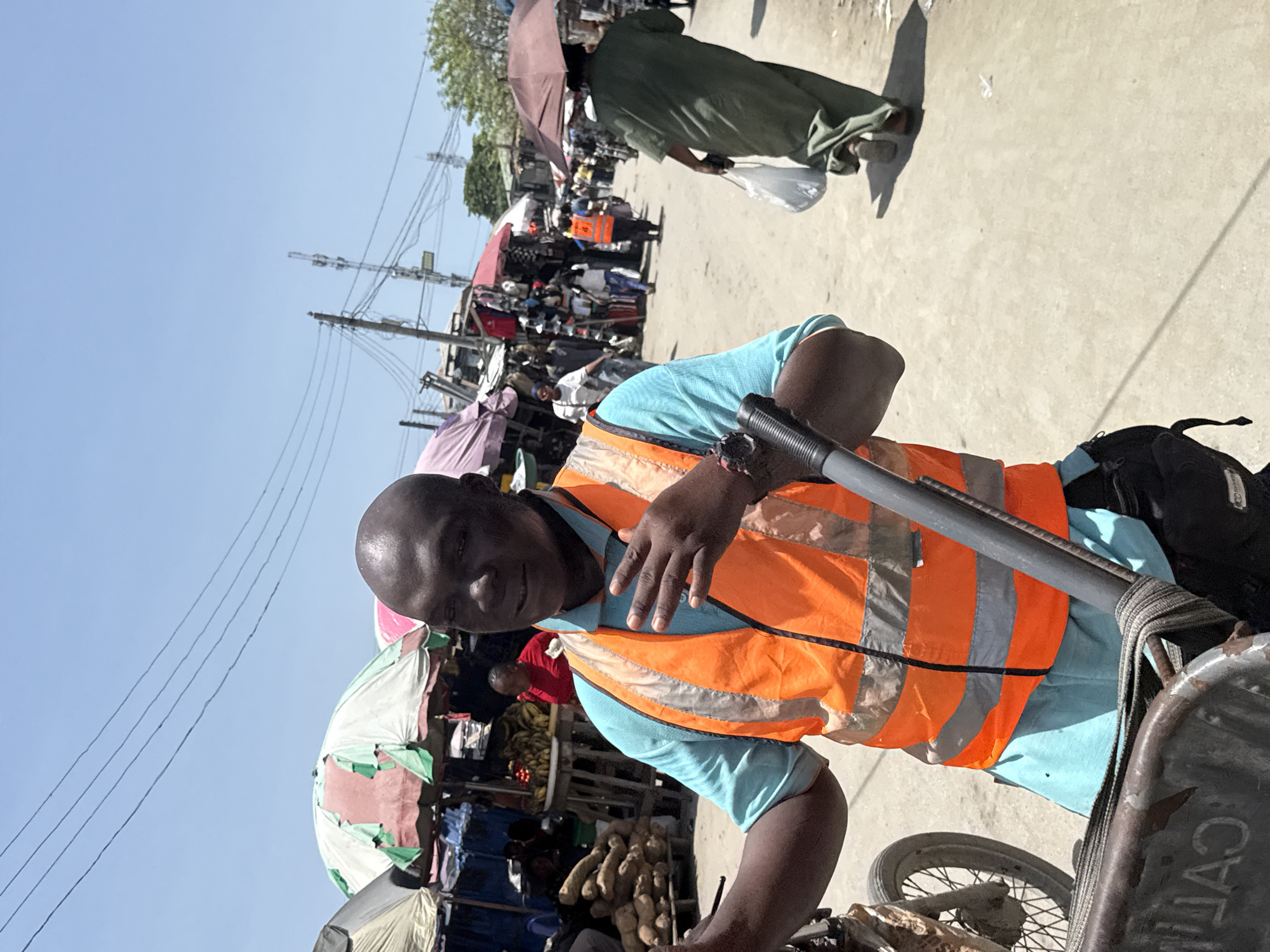 A man in a blue shirt and an orange safety vest is pictured in a medium, upward-angled shot. He is riding a bicycle-powered vehicle in what appears to be a crowded marketplace. The location is likely Lagos, Nigeria, given the scene's characteristics. The man is glancing towards the camera with his hand raised. In the background, there is a crowded marketplace with multiple stalls covered by umbrellas. People are shopping and walking in the street. Power lines stretch across the sky. The ground appears to be dusty or concrete. Another person, holding a bag and an umbrella, is visible in the background, walking along the street.