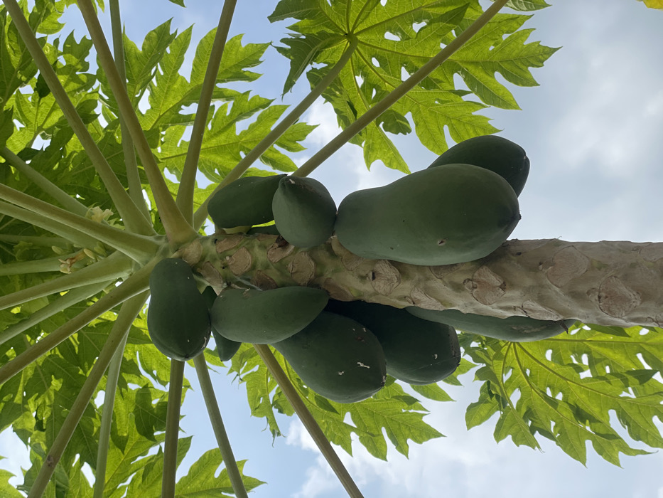 - "A low-angle view captures the upper trunk and crown of a papaya tree (Carica papaya) in Kumbang, Indonesia, set against a partially cloudy blue sky" by FM-56aBo1, licensed under CC BY 4.0