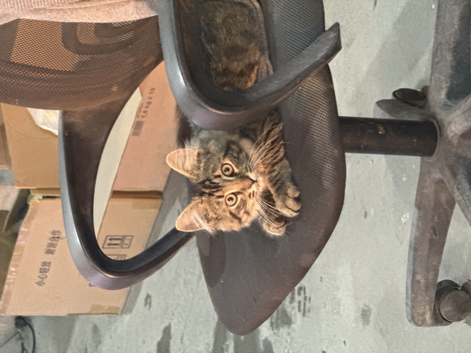 A fluffy, tabby cat sits nestled in a dark mesh office chair. It peers upwards with wide, curious eyes. The chair's arms curve around the feline, and the metal base is visible. Brown cardboard boxes are in the background. The floor looks gray and dusty.