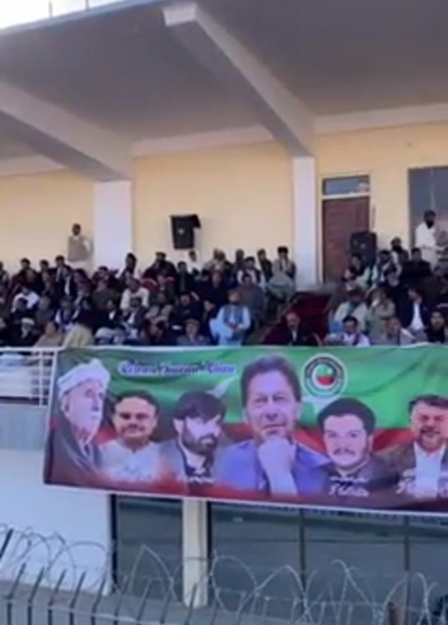 crowd of people sitting on bleachers in an outdoor stadium. There are banners hanging in front of the bleachers with portraits of several men, including Imran Khan. A man is speaking at a podium in front of the crowd. There is a flag flying in the background, possibly the flag of Pakistan. The sky is clear and the sun is shining. The atmosphere appears to be political.