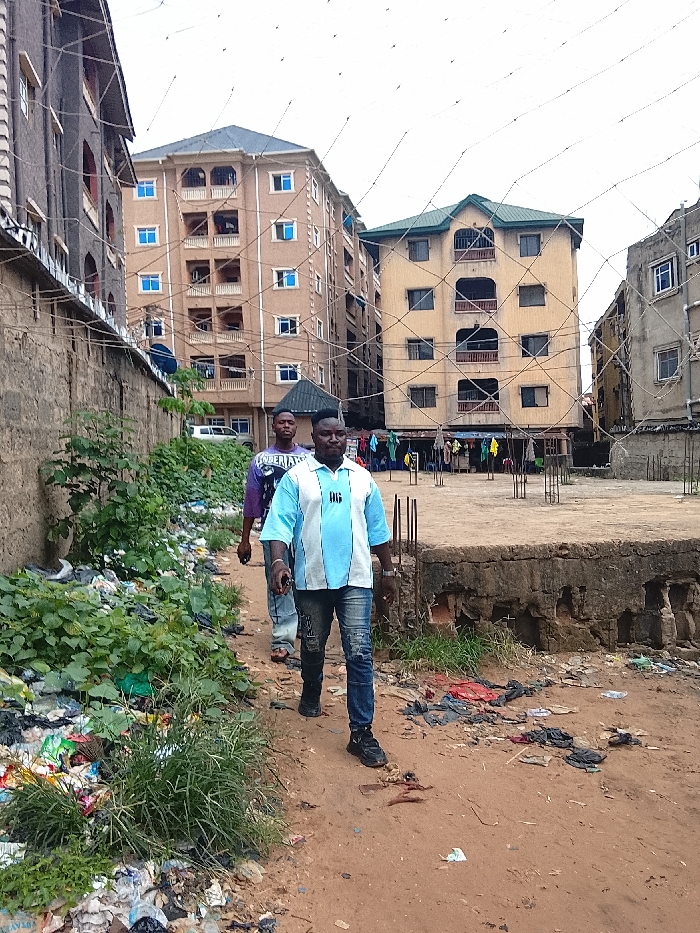 This image depicts an outdoor urban environment in Awada, Nigeria, under an overcast sky. Two adult males are walking towards the viewer on an unpaved reddish-brown dirt path. The male in the foreground wears a light blue and white striped polo shirt, ripped blue jeans, and dark athletic shoes, holding a dark object in his left hand. The second male follows closely behind, dressed in a purple t-shirt, light-colored trousers, and sandals. To the left of the path, a concrete wall is bordered by a substantial accumulation of garbage and overgrown green vegetation. In the background, multiple multi-story buildings are visible. These include a five-story tan building with blue-framed windows and a dark roof, and a four-story tan building with dark-framed windows and a green roof, its lower level appearing to house commercial activity with clothes displayed. Partial views of other multi-story residential structures are also visible on the far left and right. In the midground to the right, a raised concrete slab, consistent with a foundation or abandoned construction, exhibits exposed rebar and eroded edges. Scattered debris and refuse are present on the dirt path and around this slab. A dense network of thin utility wires crisscrosses the upper portion of the frame against the bright sky. A white vehicle is partially discernible behind the concrete wall on the left.