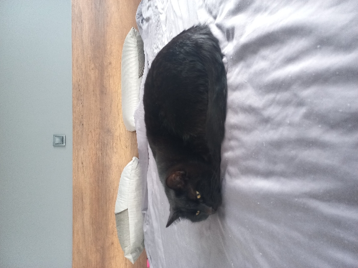 - "A domestic black cat is resting on a bed in an interior residential setting" by FM-zBVfN2, licensed under CC BY 4.0