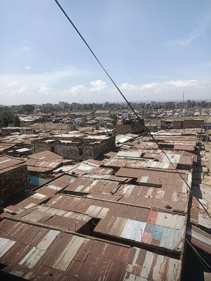 A high-angle, panoramic daytime photograph depicts a densely populated urban area under a clear blue sky with scattered white cumulus clouds. The foreground and midground are dominated by a vast expanse of closely packed, largely informal structures. The roofs are predominantly corrugated metal, exhibiting significant rust, with interspersed sections of newer, unrusted galvanized steel and a few panels painted in blue and red. Buildings appear to be constructed from various materials, including bricks and concrete, with some structures showing signs of disrepair or being unfinished. A prominent, partially dilapidated multi-story concrete building with an exposed rebar frame is visible in the mid-left. A dark, taut cable diagonally traverses the upper right portion of the frame, partially obscuring the view. In the background, a more developed urban skyline with taller buildings and additional infrastructure, including a communication tower, is visible on the horizon. The environment appears dry, with minimal lush vegetation. No individuals, specific actions, or interactions are discernible. The location is in the city of Unknown, Unknown.