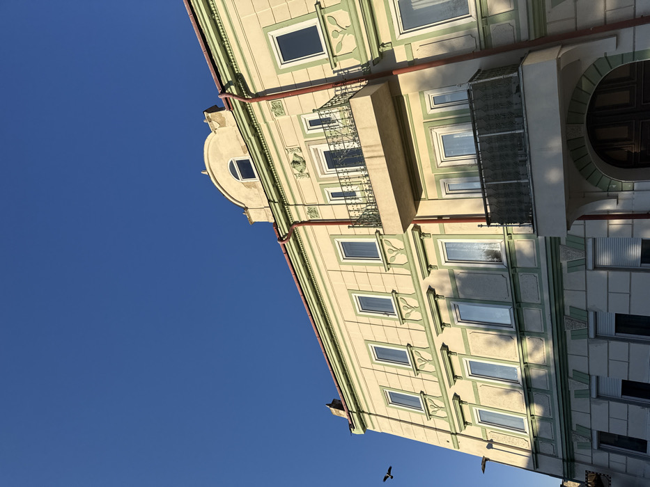 The image displays the facade of a multi-story building located in Hainburg an der Donau, Austria, viewed from a low angle against a clear blue sky. The building's exterior is predominantly cream-colored, adorned with light green decorative trim, including cornices, window surrounds, and stylized leaf motifs. Reddish-brown downspouts run vertically along the facade. The upper-most visible section includes a pitched roofline with a semi-circular arched window set within a cream-colored pediment. Below this, two primary floors feature multiple rectangular windows with white frames. The second floor from the top presents a projecting balcony with an ornate black metal railing, accessible via a dark doorway. A sculpted relief is centered above this upper balcony. Directly below, on the first floor, another projecting balcony of similar design with an ornate dark metal railing is present. A green mesh or fabric partially covers the facade area immediately behind the lower balcony's railing. The ground floor exhibits rectangular windows, some equipped with closed white roller shutters, and a large, partially visible arched entrance framed by light green trim, containing dark double doors. Strong, directional sunlight illuminates the building, casting defined shadows on the lower facade sections and beneath the balconies. A single, dark, silhouetted bird is captured in flight in the upper-left portion of the clear blue sky. A light pole is partially visible on the far left edge of the image. No individuals or discernible interactions are depicted.