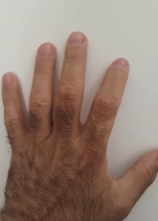A hand rests against a white surface. The hand is hairy, with short, unpolished nails. It's positioned flat against the surface, fingers slightly spread. The background is plain and out of focus.