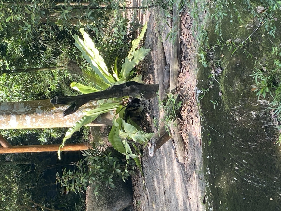 A large Komodo dragon is positioned vertically on a tree trunk, facing the viewer. A lush fern grows around a horizontal branch above the dragon, with dense foliage filling the background. To the dragon's right is what appears to be a stream or body of water, with vegetation extending down the bark. The scene is bathed in natural light, highlighting the textures of the bark, leaves, and dragon's scales.