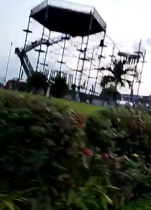 tall outdoor rope course with a steel frame and multiple levels. There are stairs leading up to the course. A man with a beard walks toward the camera briefly, then walks away. The surrounding area has green foliage and grass. The sky is overcast.