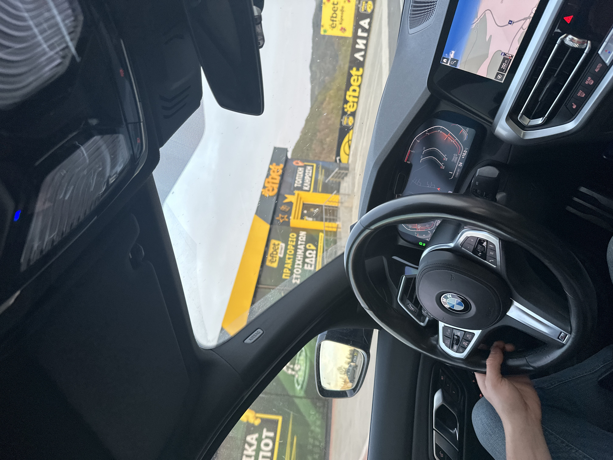 interior of a BMW car, presumably taken from the driver's seat. The steering wheel is prominently visible, with the BMW logo in the center. The dashboard includes a digital display showing the speedometer, current gear (D4), outside temperature (+16.0°C), and other vehicle information. To the right of the steering wheel is another screen displaying a navigation map. Outside the car, through the windshield, are visible advertisements for Efbet, a betting company, in both English and Greek. The advertisements include the phrases "TOPICH KAHPOCH" and "ΠΡΑΚΤΟΡΕΙΟ ΣΤΟΙΧΗΜΑΤΩΝ ΕΔΩΡ". Also visible is "efbet лига" which translates to Efbet league. The location is the city of Kirkovo, Bulgaria. A hand can be seen holding the steering wheel. The sky is overcast.
