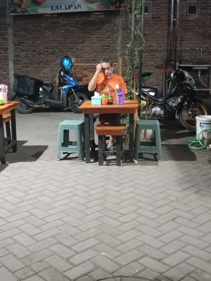An evening scene in Ketapang, Indonesia, depicts a casual outdoor eating establishment with a male patron. The individual, appearing middle-aged, wears an orange short-sleeved shirt and light-colored shorts, seated on a small wooden stool at a rectangular wooden table. His right hand is raised, with fingers touching his forehead. On the table are a light blue container, two small condiment bottles, and a purple cylindrical container holding cutlery. Two empty light-green plastic stools are positioned near the table. The ground is paved with light grey interlocking pavers in a herringbone pattern. In the background, a dark red brick wall serves as a backdrop. Parked against this wall are two motorcycles: a black scooter with a delivery box and a blue helmet, and a black sport/underbone motorcycle with orange wheel accents. Above the motorcycles, a sign partially displays the word "LALAPAN." A vine grows vertically along a pole between the seating area and the wall. To the right, a white bucket with "Aqua" branding and a coiled green hose are visible on the ground. The area is artificially lit, casting shadows.