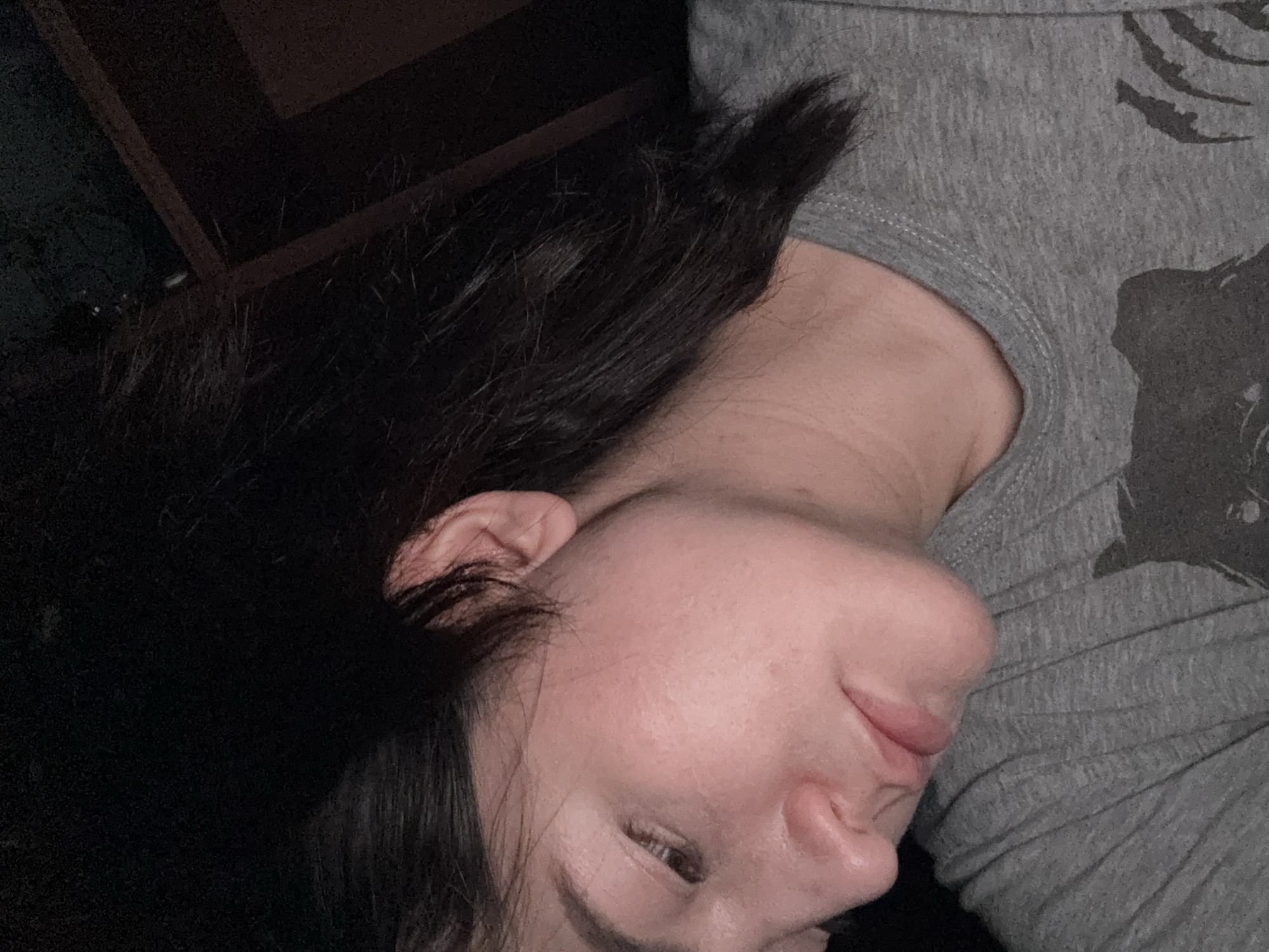 A single individual is depicted in a close-up, angled portrait format, presumably in an indoor setting within Kurovskoye, Russia. The specific location within Kurovskoye is not discernible from the visual evidence. The subject is an adult, presenting with dark hair, visible on the head and extending around the ear and neck. The individual's skin tone is light, with a slight pinkish flush on the visible cheek. They are looking downwards and to the right of the frame, with eyes cast low or partially closed. The subject wears a light grey, possibly heathered, crew-neck t-shirt. A dark, indistinct graphic, appearing to be a silhouette of a creature, is visible on the lower right portion of the shirt. The background is predominantly dark, indicating low light conditions. Dimly visible dark wooden structures, possibly shelving or architectural elements, are present in the upper right portion of the background. Lighting appears to originate from the upper left, illuminating the left side of the subject's face and shoulder more brightly.