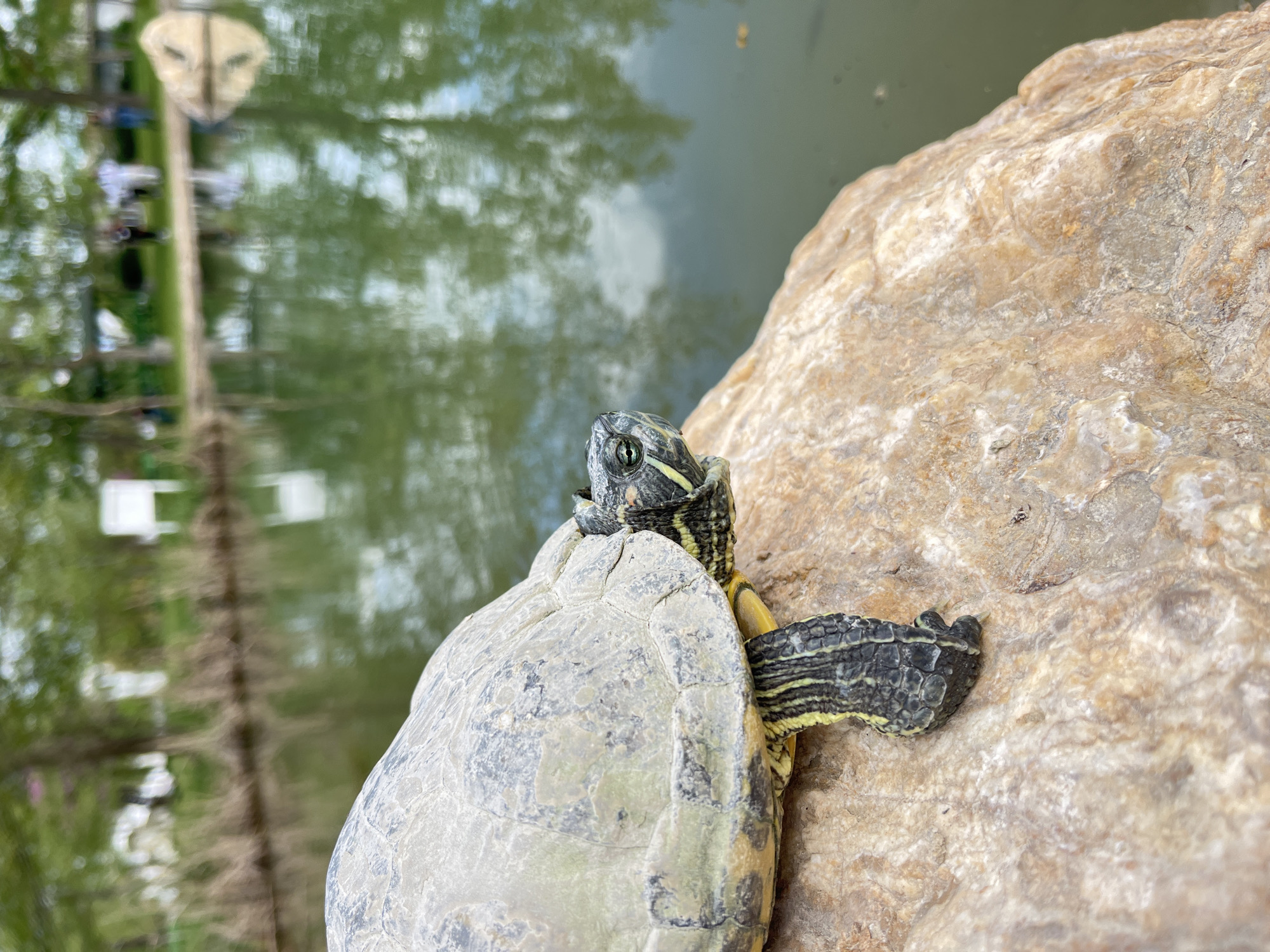 A turtle rests on a large, rough rock next to a body of water. The turtle is primarily gray and black with yellow markings on its head and legs. The water reflects trees and other objects, possibly structures of General Todorov, Bulgaria.