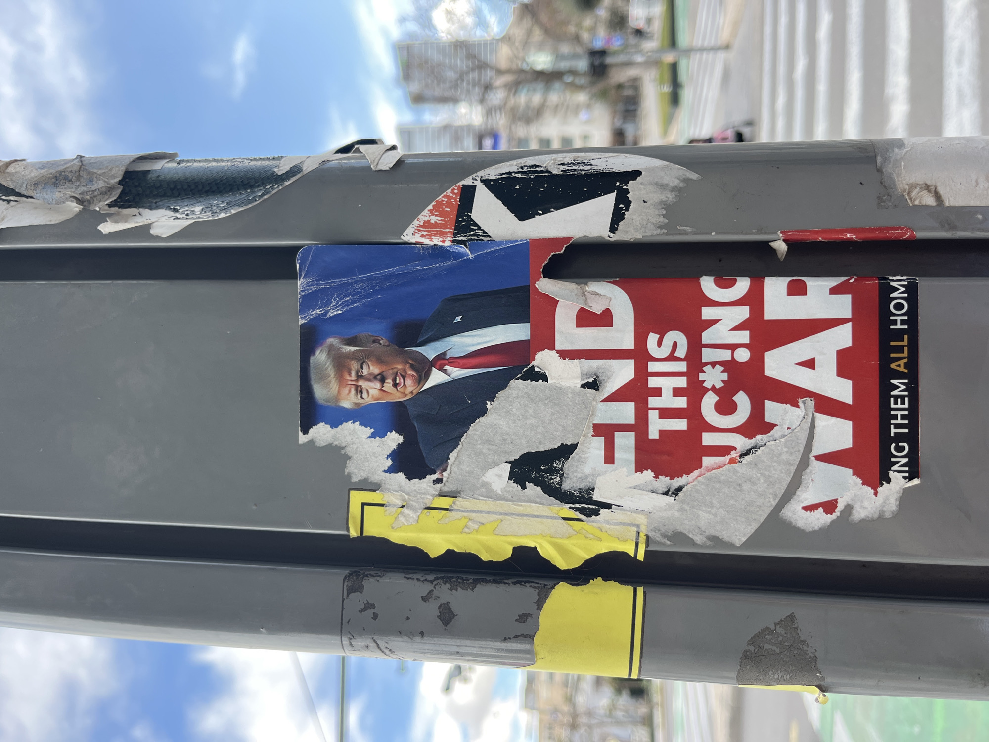 The image displays a dark grey, square-profile utility pole or street sign pole in the city of Tel-Aviv, Israel, seen on a daylight with a partly cloudy blue sky overhead. The pole's surface is heavily covered with multiple layers of weathered, torn, and peeling paper posters and stickers. A prominent poster features a headshot of Donald Trump, depicted wearing a dark suit and a red tie against a blue background, with his mouth slightly open as if speaking. This specific poster exhibits significant tearing along its lower and right edges. Directly beneath the Trump poster is another large red poster with bold white capital letters. This red poster is also extensively torn, but the visible text clearly reads: "END THIS UC*!NG WAR." Below this, a black strip with white text is partially visible, showing "ING THEM ALL HOM," suggesting the full phrase "BRING THEM ALL HOME." Other remnants of adhesive materials and previous stickers, including a bright yellow rectangular strip and a black and white geometric design, are visible on different sections of the pole. The background, blurred due to depth of field, shows a green-painted bicycle lane on a paved street, followed by a white pedestrian crosswalk. Distant, modern multi-story buildings form the urban skyline, and a faint, blurred figure is discernible in the far background near the crosswalk.
