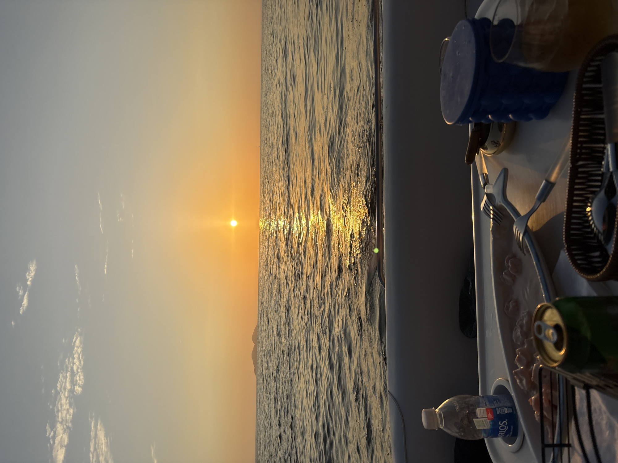 The image depicts a sunset scene over the Pacific Ocean, observed from the deck of a boat in the city of Ancón, Peru. The sun, a prominent orange orb, is low on the horizon, slightly right of center, casting a strong golden reflection path across the gently rippled water. A distant, multi-peaked landmass or island is silhouetted against the bright horizon on the left side, with a faint sailboat silhouette visible on the far right horizon. The sky above transitions from a pale blue with scattered white clouds at the top to a clear, vibrant orange and yellow near the horizon line. In the foreground, the white railing and deck structure of the boat are visible. On a white, flat surface or tray on the deck, various items are arranged: * A clear plastic water bottle, partially labeled "CARLOS," is seated in a cupholder on the left. * An oval white serving dish holds multiple pieces of prepared, light-colored seafood, resembling shrimp or similar items. Serving tongs are positioned next to this dish. * A green beverage can with an open tab is in the foreground, slightly out of focus. * A dark woven basket contains assorted cutlery, including forks and spoons. * A blue, textured ice bucket with a lid is present. * A brass-colored ashtray, containing a cigar, is situated near the ice bucket. * A clear glass filled with an amber liquid and ice cubes is visible on the right. No individuals are visible in the frame, though their presence is implied by the arrangement of the dining and leisure items on the boat deck.