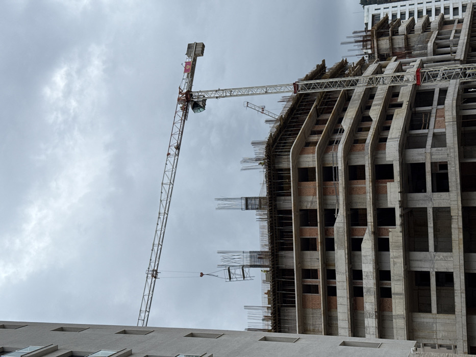 An active construction site is depicted in Budva, Montenegro, under an overcast, uniformly gray sky. The scene is dominated by a multi-story building in an advanced stage of concrete and brick construction, featuring numerous unglazed window openings. The uppermost completed floor displays wooden formwork and vertical rebar, indicating ongoing structural work. Two individuals, clad in yellow high-visibility attire, are observable on this top level. A prominent white and red tower crane extends its jib across the site, actively hoisting a bundle of metal scaffolding via cables towards the upper floors of the central building. A Montenegrin national flag is affixed to the counter-jib of the crane. To the right, another multi-story building in a similar state of construction is partially visible. On the far left, a portion of a completed, light-colored multi-story building with balconies frames the scene.