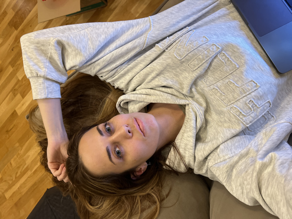 A fair-skinned woman with long brown hair lies on a light brown couch, partially atop a laptop. She wears a gray hooded sweatshirt with the letters "NEW" embossed on the front. The background consists of light brown wooden flooring and a cardboard box in the upper left corner. The woman faces the camera with a serene expression. Her left arm is raised, her hand resting near her head.