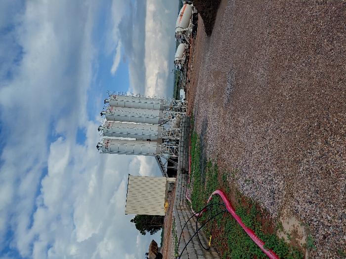 This image depicts an industrial construction site under a partly cloudy sky, located in Bni Yakhlef, Morocco. The foreground features a low retaining wall constructed of cinder blocks on the left, adjacent to an area of reddish-brown soil and green vegetation. Several red and black hoses are laid across this vegetated strip. The majority of the foreground and mid-ground is covered by a large expanse of reddish-brown gravel. In the mid-ground, a dark green tree is visible behind the retaining wall, with a portion of heavy machinery (possibly a loader) on an elevated dirt mound to its left. To the right of the tree, a light-colored structure with a textured facade is present. The central focus is a concrete batching plant, composed of six tall, white, cylindrical silos, each bearing a partially legible red logo near the top, supported by a metal framework. A conveyor belt system extends towards the plant from the left. Further to the right, two white concrete mixer trucks are visible, one parked and the other positioned near a large pile of dark aggregate material. A smaller white vehicle is also present in the distance. The background consists of a blue sky with scattered white cumulus clouds and a distant, slightly blurred green landscape on the horizon. No individuals are visible in the scene.