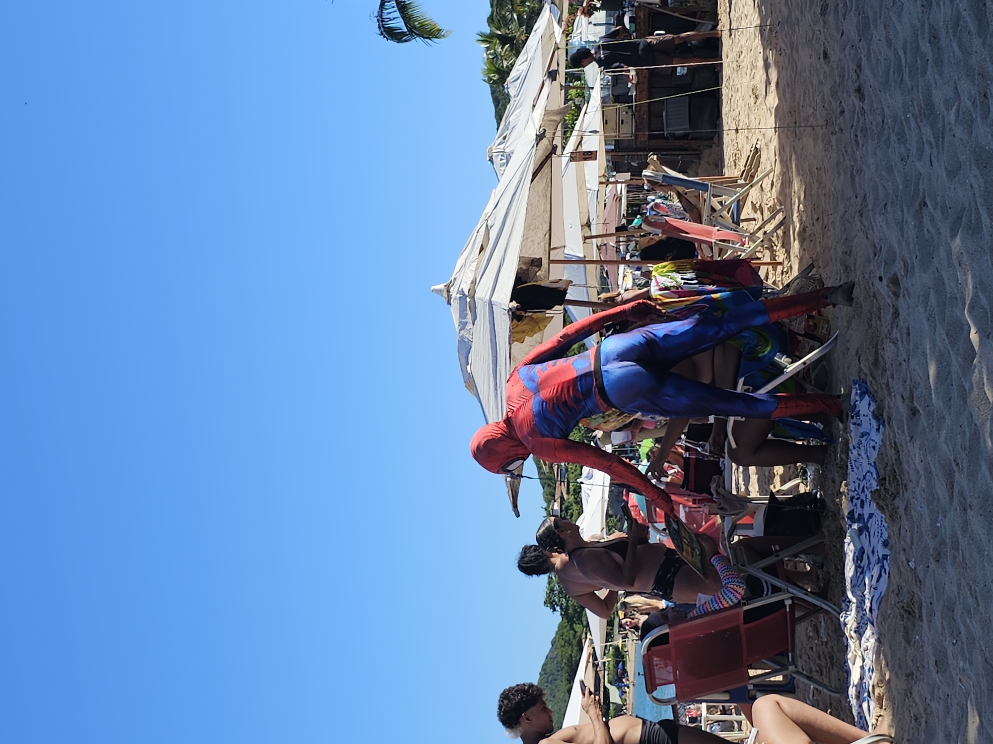 Captured from a sideways perspective, the image depicts a sun-soaked beach scene in Armação Dos Búzios, Brazil. A person adorned in a Spider-Man costume is interacting with beachgoers. Beach umbrellas provide shade, and people are seated in chairs on the sandy beach. Some people are engaged with their mobile phones. The sky is clear.