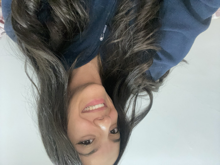 A woman with long, dark hair smiles warmly at the camera. She's wearing a navy blue jacket or sweater, partly unzipped. The background is a plain white wall. Her expression is friendly, and her teeth are visible in the smile. The image appears slightly tilted.