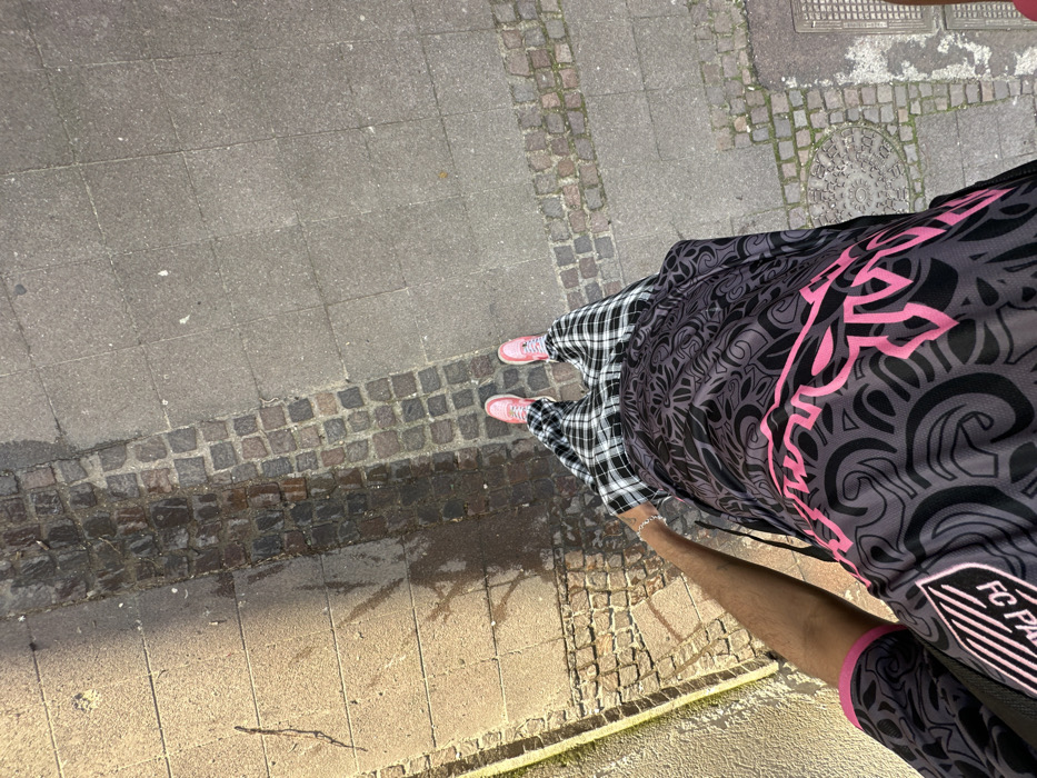 An overhead view captures a person standing on a sidewalk in Rueil-Malmaison, France. The individual wears a dark gray short-sleeved shirt with prominent pink tribal-style graphics and "FC PARIS" lettering on the right shoulder, black and white plaid trousers, and pink athletic shoes with white soles. A dark strap from a backpack is visible over their left shoulder. The right arm is partially visible, with a silver-colored bracelet on the wrist. The ground consists of large gray rectangular concrete paving slabs on the left, an intermittent strip of smaller, dark-colored cobblestones down the center, and a brighter, lighter-toned paved surface to the right, which shows a significant wet patch and strong sunlight casting distinct shadows, including the person's shadow. A circular metal manhole cover with an embossed pattern is visible on the concrete sidewalk in the upper left.