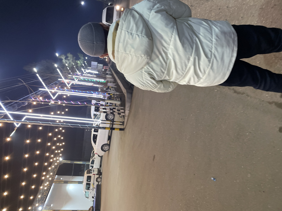 A person wearing a light-colored puffy jacket and a gray beanie stands on a paved surface at night. A row of white vans is parked nearby, lined up beneath a structure adorned with strings of lights. Additional lighting spans overhead, creating a festive atmosphere. The scene appears to be outdoors.