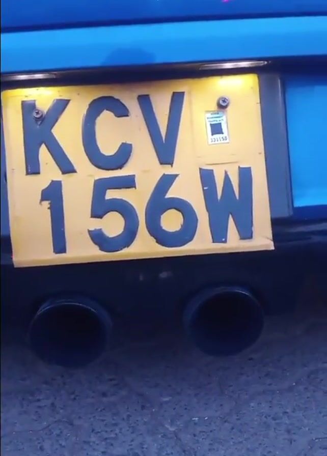 The video focuses on the rear view of a blue Volkswagen Golf R, parked on cracked pavement, with people visible in the background. The car has dual exhaust pipes, a yellow license plate with the Kenyan registration "KCV 156W," and stickers on the rear window that say "AIRLIFT3H", "Night Driving" written in English and Japanese and a Monster Energy sticker. A sticker for "The Vic Hotel Ltd." is below the Volkswagen logo. The camera zooms out to show the entire car and its surroundings. The lighting suggests it is dusk. The engine is idling, producing a noticeable sound.