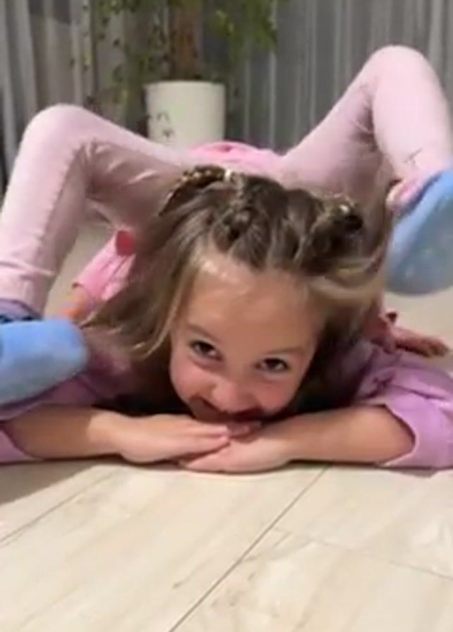 A little girl with light brown hair, pink leggings, and a pink shirt is performing a contortionist pose on a wooden floor. Her legs are bent backwards so that her feet rest behind her head. She is wearing blue and pink slippers. She is smiling at the camera and has her arms resting on the floor in front of her. Behind her is a white curtain and a potted plant. Another little girl pops up from behind the first girl. She has blonde hair and is also wearing pink leggings and a pink shirt. She smiles and then disappears again.