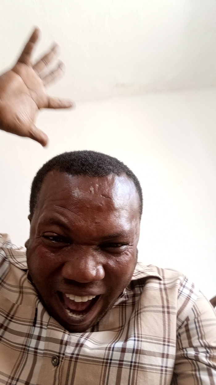 A close-up, low-angle portrait features an adult male with dark skin and short dark hair, centered in the lower frame, against a plain, light-colored background. The male subject is depicted with his mouth wide open, revealing upper and lower teeth, conveying an exaggerated expression of shouting or yelling. His eyes are narrowed, and his forehead is wrinkled, showing distinct lines and some minor scarring. He is wearing a plaid shirt with a pattern of light brown, dark brown, and possibly blue lines. In the upper left quadrant, a dark-skinned right hand is visible, blurred due to motion, with fingers slightly splayed and curved, positioned above and to the left of the subject's head. The immediate environment is an indistinct, uniformly lit, light-colored interior wall or ceiling. The specific location in Jos, Nigeria, cannot be determined from the visual information provided in the image.