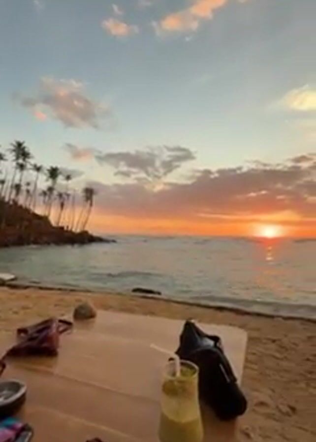 table on a sandy beach at sunset. On the table are sunglasses, a purse, an ashtray, a pack of cigarettes, and a glass of green juice. In the background, there is a view of the ocean and a row of palm trees. The sun is setting over the ocean, casting a warm glow on the scene.