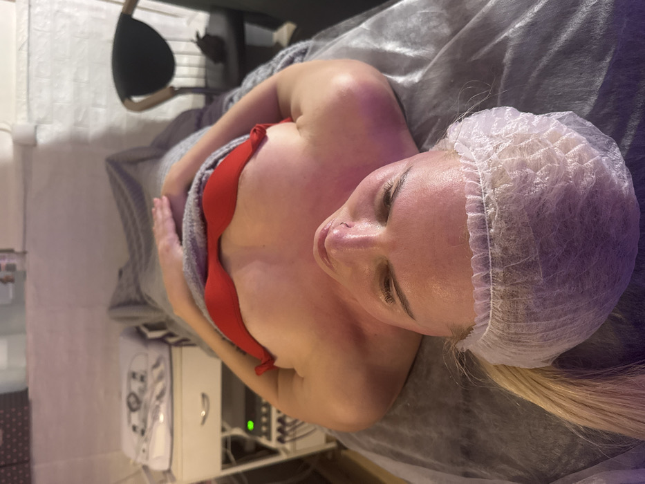 An individual is depicted lying supine on a treatment bed covered with a disposable grey sheet, positioned in what appears to be a professional aesthetic or medical room. The specific location within Saint Petersburg, Russia, cannot be identified from the provided visual information. The subject is a light-skinned female with blonde hair pulled back, wearing a white disposable hair net. She is dressed in a red bra, with a grey blanket or towel covering her lower torso and legs, extending up to her chest. Her eyes are closed or partially closed. Redness is visible on her upper chest and shoulders, suggesting a recent topical application or skin treatment. Her hands are resting on her abdomen under the blanket. To the left of the subject, a white mobile cart holds a piece of aesthetic equipment with multiple dials, connectors, and a green indicator light illuminated. Several cables extend from this device. To the right, a dark-seated chair with a light wooden frame is partially visible against a light-colored wall. The overall environment suggests a clinical or spa setting.
