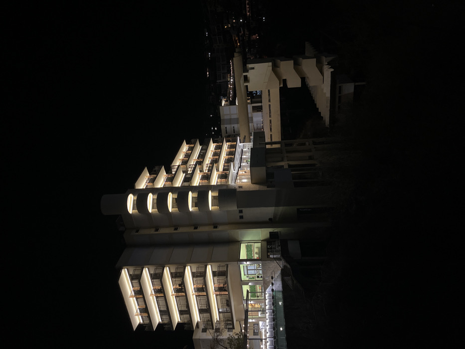 An elevated, wide-angle night photograph depicts a brightly illuminated, multi-story building situated in Veliko Tarnovo, Bulgaria. The structure, likely a hotel or large residential complex, features a light-toned facade and multiple terraced floors. Each floor is equipped with individual balconies defined by dark railings and illuminated by linear strip lighting positioned beneath the eaves, casting a consistent warm glow. A prominent, vertical cylindrical architectural element on the building's front right side contains several evenly spaced, circular recessed lights. Lower sections of the building incorporate large glass windows, revealing interior spaces that are also brightly lit. An outdoor terrace area on a mid-level includes what appears to be a pool or water feature and multiple potted plants. A suspended pedestrian walkway extends horizontally from the main building to a secondary, lower structure. This structure then transitions into a series of exterior staircases that descend down a steep, unlit slope. The foreground is dark and indistinct, indicating unlit terrain or vegetation. The sky overhead is uniformly dark, devoid of stars or moon. In the distant background, faint scattered artificial lights suggest the presence of a wider urban area. No individuals are visible within the frame.