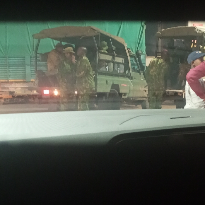 - "group of people, possibly military or security personnel, standing around or in the back of two light olive green trucks" by FM-iEAFO2, licensed under CC BY 4.0